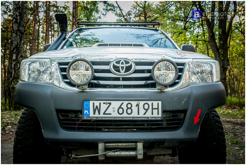 Wieloletnie doświadczenie z Hiluxami (ten egzemplarz to już trzeci pick-up Toyoty używany przez właściciela) sprawiło, że do auta założono zestaw amortyzatorów, sprężyn i wieszaków resorów OLD MAN EMU, pozwalający tylko na 2" liftu. Zastosowane sprężyny - najtwardsze z możliwych (do 150 kg) dedykowane do auta z wyciągarką i stalowym zderzakiem pozwalają na dynamiczne pokonywanie przeszkód. Większe podnoszenie pojazdu w przypadku Hiluxa nie sprawdza się. Auto gorzej się prowadzi i zawieszenie poddawane jest większemu zużyciu, przez co może być bardziej podatne na awarie. Aby zmieścić większe opony w rozmiarze 33" dodano "body lift" o wysokości również 2" oraz dodatkowo podcięto zderzak. Jego poszycie jest łatwo zdejmowane razem z atrapą chłodnicy i lampami, co dodatkowo pozwala na łatwiejsze operowanie przy wyciągarce w razie problemów.