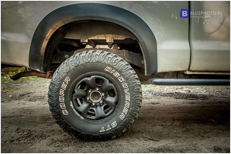 O odpowiednią trakcję w terenie dbają opony Discovery Cooper SST założone na 16-calowe, stalowe felgi od Nissana Terrano. Dodatkowo, aby poprawić trakcję i prowadzenie, dodano dystanse firmy Hoffman. Obowiązujące w naszym kraju przepisy nie pozwalają, aby koła wystawały poza obrys pojazdu. Niezbędne więc okazały się nadkola. Zastosowano oryginalne rozwiązanie Toyoty, dodawane wyższych wersji wyposażenia.