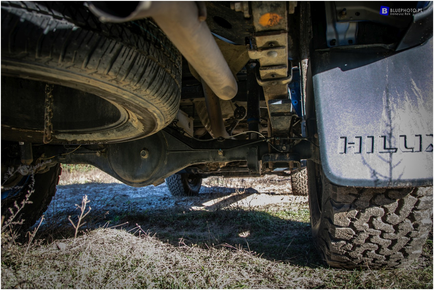 Auto posiada niezależne zawieszenie z przodu, więc wszelkiego rodzaju liftowanie większe niż dwa cale nie wchodzi w grę ze względu na nieprawidłową pracę takiego rozwiązania. Hilux został więc maksymalnie podniesiony (2”) poprzez założenie dłuższych sprężyn oraz dostosowanych dłuższych amortyzatorów firmy OME. Co ciekawe tył pozostał oryginalny i teraz auto ładnie się „wyrównało”.