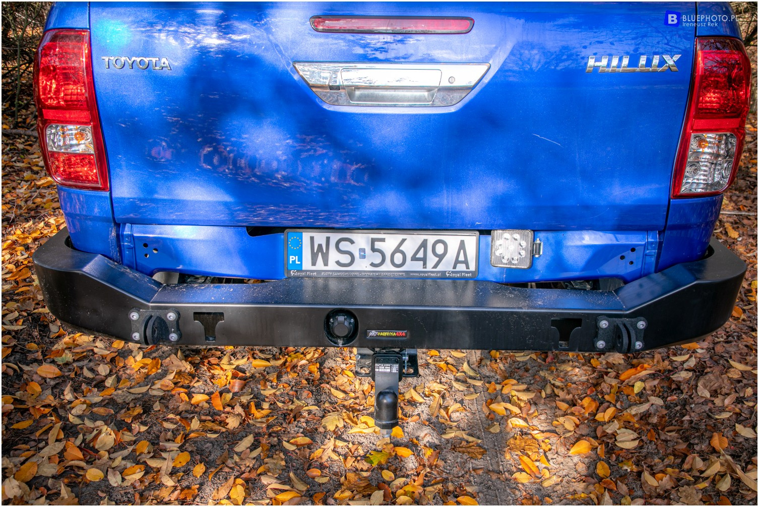 Tak jak wspominaliśmy w jednym z dedykowanych temu tematowi artykułów obecnie na rynku nie ma produktów, które spełniają warunki homologacji i można byłoby je wykorzystać z przodu pojazdu. W tym Hiluxie mamy zatem oryginalny, toyotowski przedni zderzak. Zupełnie inaczej jest z tyłu. Tutaj dosyć ładny i praktyczny element (posiada stopień ułatwiający wsiadanie) został zastąpiony stalowym zamiennikiem wyprodukowanym przez Fabryka4x4. Poza funkcją ochronną, posiada on jeszcze inne, cenne w terenie cechy. Jedną z nich są wycięcia pod podnośnik HiLift. Ponadto posiada on solidne zaczepy oraz wbudowane mocowanie haka holowniczego montowanego „na kwadrat” z gniazdem zasilającym ukrytym w stalowym korpusie zderzaka.