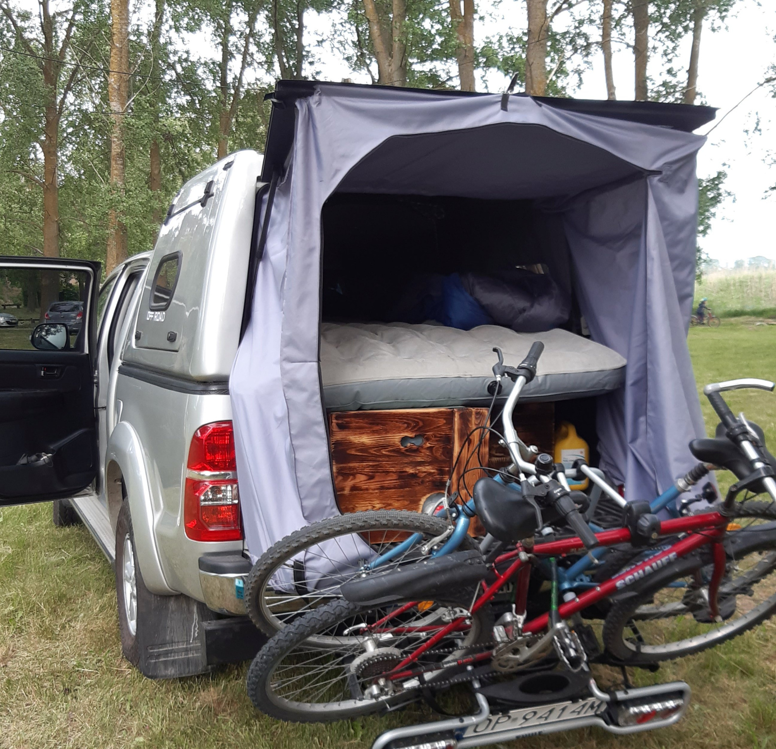 Na początek, póki nie ma tego co mi się marzy, zakupiłem zwykłą zabudowę, ale nieco podwyższoną. Doszyłem do tego namiot, zrobiłem szuflady i powstał taki bidacamper, w którym można było się przespać. Zrobiliśmy z żoną dwa wyjazdy po dwa tygodnie i było całkiem fajnie.