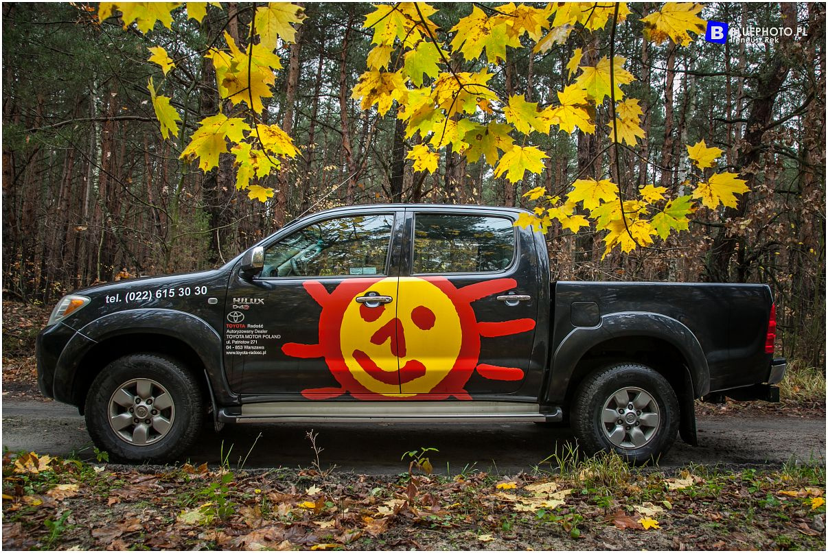 Staruszek czyli 9-cio letni pick-up w topowej wersji wyposażenia SR5 i silnikiem 2,5 D4D – czekał na nas rankiem przed szpalerem nowiutkich Toyot. Nasz osiołek zupełnie gubił się w tym towarzystwie. Czarny lakier, lekko zmatowiały, przydymione wiekiem klosze lamp przednich, standardowe zawieszenie – zero gadżetów czy wodotrysków. Taki zwykły, roboczy muł z jednym elementem wyróżniającym wśród innych pojazdów – pięknym, wielkim, uśmiechniętym słońcem zdobiącym jego boki.
