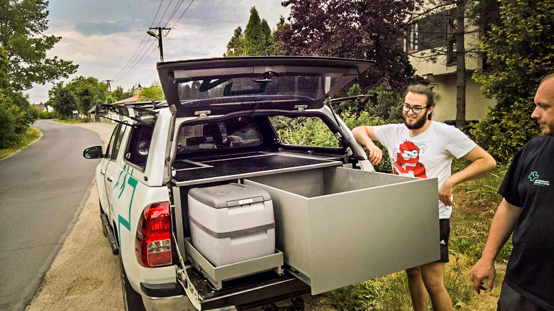 Aby móc zabrać jak najwięcej wyposażenia, paka Hiluxa zyskała nadbudówkę. Jest ona głęboka (150 cm) i utrudnia wygodne wyjmowanie bagaży, nawet pomimo uchylnych, bocznych okien. Rozwiązaniem w tej sytuacji okazał sie przemyślny system szuflad i schowków wykonany własnoręcznie ze sklejki.