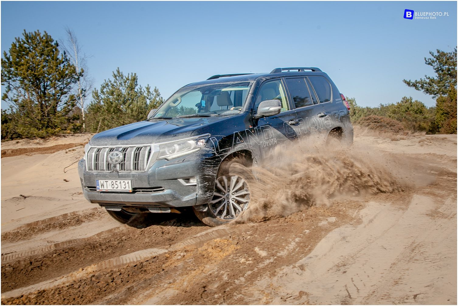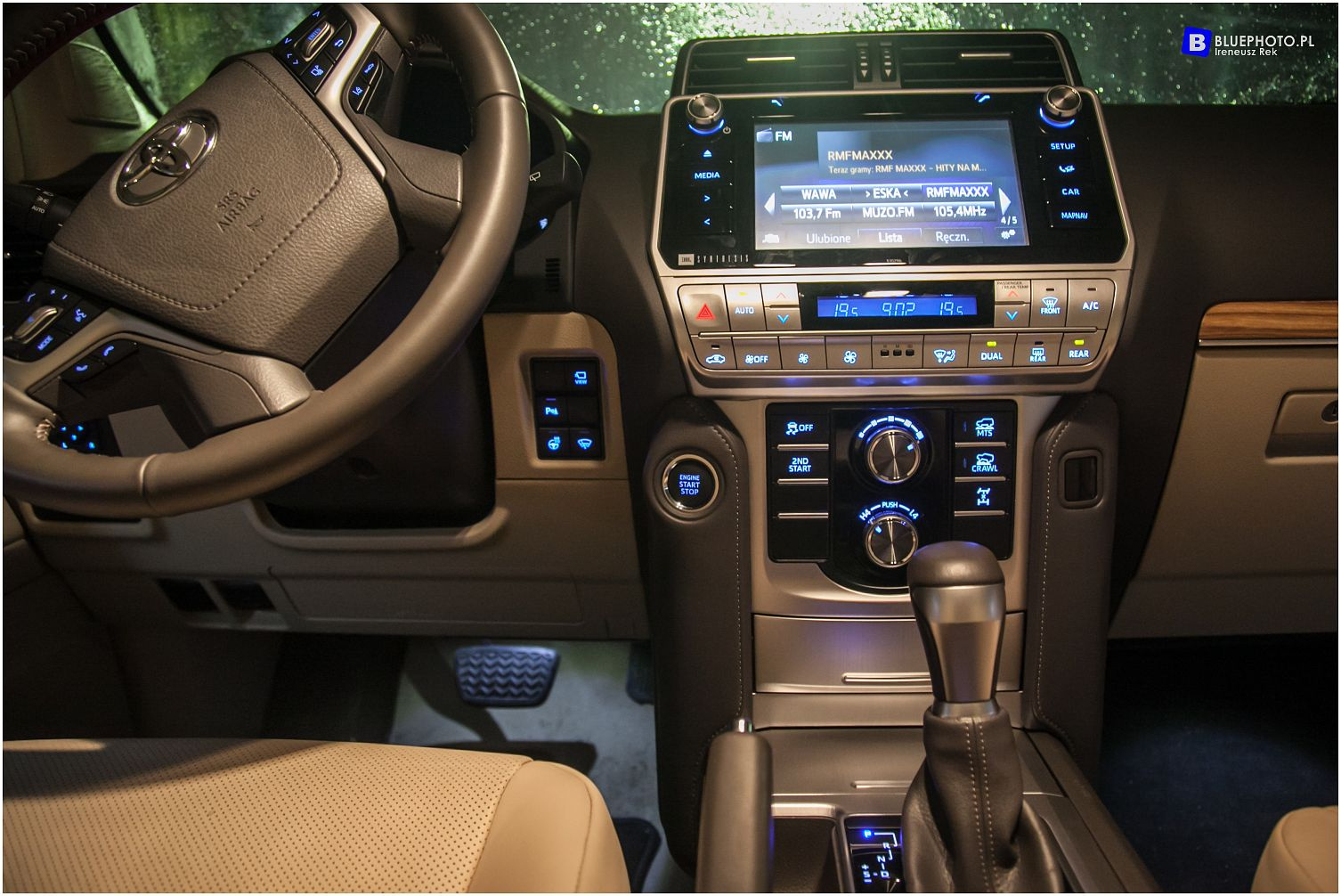 Dzięki Toyocie Radość do testowania mamy auto o najbogatszej specyfikacji. Nowe modele Land Cruisera 150 dostępne są w trzech wersjach kolorystycznych wnętrza – czarnej, brązowej i beżowej. Wersja beżowa, z drewnianymi wstawkami i w jasnej, skórzanej tapicerce wygląda fantastycznie. Ma tylko jedna wadę - jasna wykładzina na podłodze świetnie sprawdzi się w miejskim użytkowaniu. My, fani terenowych zmagań, wchodzący do auta w ubłoconych butach, z żalem patrzyliśmy jak te piękne, jasnobeżowe dywaniki pokrywa brud i piach...