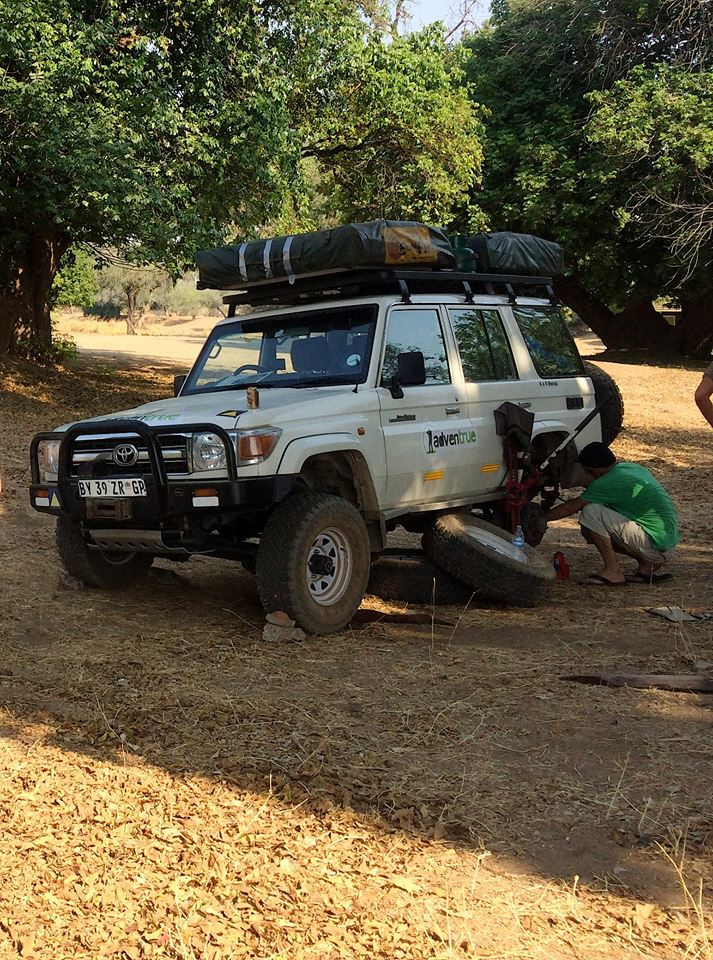 Przed nami już prosta do Parku, po drodze obowiązkowy przystanek na serwis opony i przewodu hamulcowego oraz wizyta na pobliskim targu w celu uzupełniania zapasów zimnego piwka, wody i czegoś na ząb. Przy okazji zakupiliśmy kolejne 3 pary klapek, bo te zabrane z Polski zjadły nam hieny w Mana Pools.
