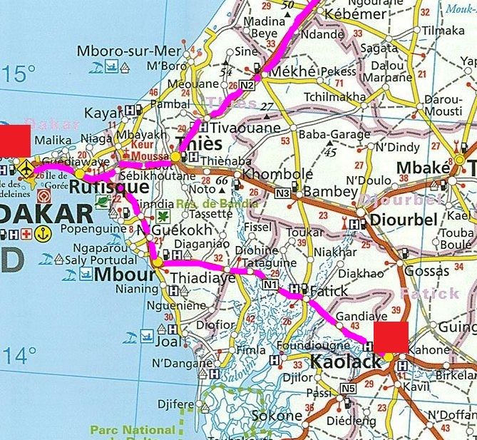 eszcze tego dnia wyjeżdżamy z Dakaru i kierujemy się na południe w stronę granicy z Gambią. Co do samego miasta, mamy trzy zdecydowane spostrzeżenia, pierwsze… jest brzydkie, drugie… pokaźna ilość ludzi na wózkach inwalidzkich, kalek i żebraków i trzecie… wspomnienia po Rajdzie Paryż- Dakar. Co po drodze? Mnóstwo ludzi handlujących owocami (arbuzy, pomarańcze, banany). Przez Mbour dojeżdżamy na przedmieścia Kaolack, i na parkingu obok stacji paliw „Elton”, pozostajemy na nocleg. Jedyne czego mamy tu pod dostatkiem to… muchy.