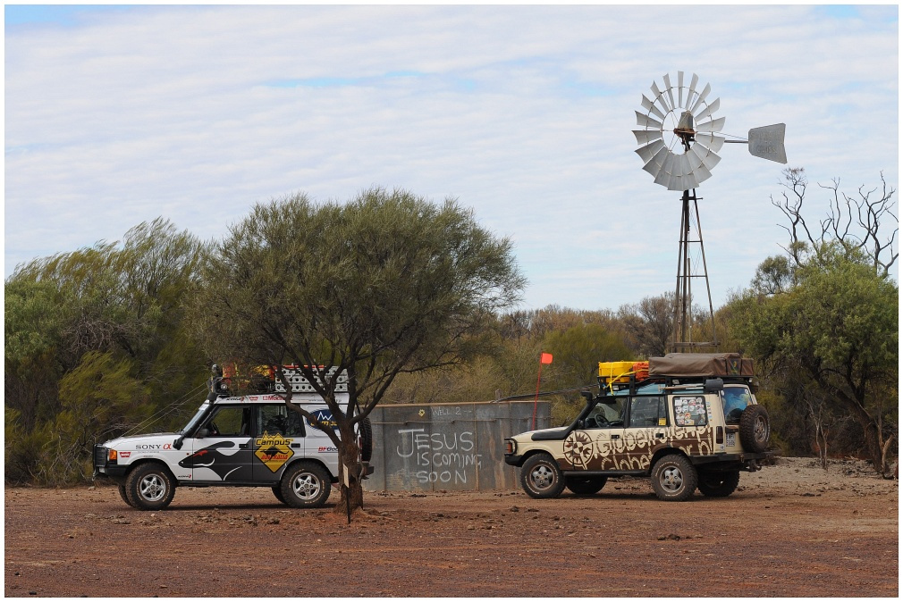 Fotografujemy po drodze wszystkie ciekawostki, znaki, pamiątki po poprzednikach czyli to co nie pasuje do pustyni i się wyróżnia. Zaliczamy jedną studnię za drugą. Jest sucho jak pieprz ale kurz i skamieniała czerwona glina pokazuje, co może tutaj się dziać gdyby chociaż trochę popadało. Pierwszy nocleg mamy miedzy studniami 6 i 7 w miejscu zwanym Windlich Springs. Jest to brzeg uroczego koryta rzeki wypełnionego wodą, pamiątka pory deszczowej, która świadczy niezbicie o tym, że na tej pustyni jest woda. Po zasłużonym odpoczynku jedziemy dalej. Spotykamy po drodze samotnego „Easy Rider’a” przemierzającego Toyotą pustynię, nigdzie się nie spiesząc, z radością żyjąc po swojemu. Kilka słów zamienione z nim uświadamiają nam, że wszyscy w promieniu kilkuset kilometrów, już o nas wiedzą dzięki komunikatom w radiu UHF - jesteśmy jak biali ludzie na Marsie, na dodatek samochodami na dziwnych numerach i bez kierownicy (po normalnej stronie). I trzeba na nas uważać oraz pomagać jak żółtodziobom bo możemy sobie zrobić krzywdę w buszu - przecież w Polsce znamy tylko śnieg i białe niedźwiedzie. Na szczęście potrafimy także dobrze i przekonywująco opowiadać o wielkich camel-spiderach, które wciągają ludzi pod piasek na pustyni oraz krwiożerczej czupakabrze, którą można także tutaj poczuć w nocy na swojej szyi, więc po kilku następnych spotkaniach w Ozzami, komunikaty radiowe przekazują dalej, że jednak trochę się znamy na pustyni, off-roadzie oraz świecie i generalnie można z nami pogadać.