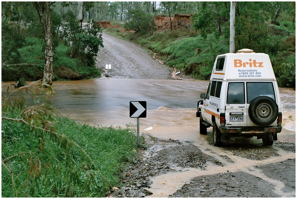 Kolejny ranek, patrzę na rzekę i… oczom nie wierzę. Rzeki nie ma! Czyżby efekt uboczny „inhalacji”? Znaczy się, rzeka jest, ale na floodway’u widać słupki pokazujące głębokość. I jak nic te 70 cm można już spróbować pokonać. Zbieram się szybko i z fajnym tęczowym kręciołkiem w głowie, bez zastanowienia, wjeżdżam w bród – woda może w każdej chwili wrócić. Dojeżdżam do Laury, nie zatrzymuję się, za osadą jest przecież drugi bród, a jak pamiętam, poprzednim razem było tam trochę więcej wody. Na szczęście nie jest jej aż tak dużo, żeby zagroziło to Toyocie i bez większego problemu przeprawiam się na druga stronę. No, jestem uratowany, zdążę na samolot, wyzdrowieję i nie będę już musiał za długo wspomagać się ożywczymi olejkami eterycznymi z eukaliptusa.