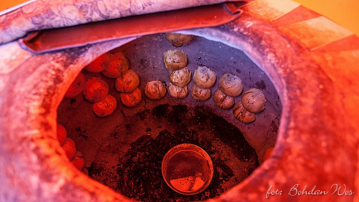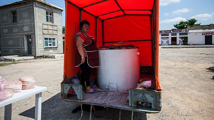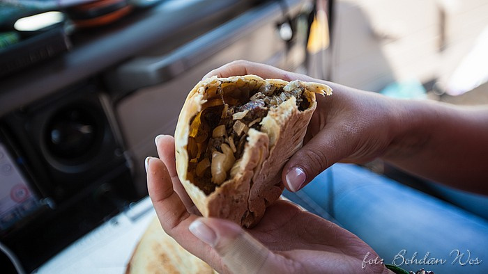 Z zup próbowaliśmy oczywiście barszczu ukraińskiego oraz soljanki - zupę z mięsem, o charakterystycznym smaku dodanych ogórków kiszonych, cytryny i oliwek. Jeśli chodzi o mięsa, króluje tu wołowina, baranina i wieprzowina. Podawana jest w różnych postaciach, od szaszłyków, kotlecików, po farsz do pysznych pierożków. W sklepach obok chipsów leżą torebki z suszonymi rybami. To idealna przekąska podczas podróży. Będąc na Ukrainie, w każdym niemal miejscu można kupić tzw. kwas chlebowy do picia. To kwaskowo – słodki napój, przypominający smakiem i kolorem coca colę. Dziś przy drodze spotkaliśmy Panią, która sprzedawała samsę. To bułka z farszem mięsno – cebulowym, wypiekana w piecu opalanym drewnem. Do wyboru – na ostro lub łagodno.
