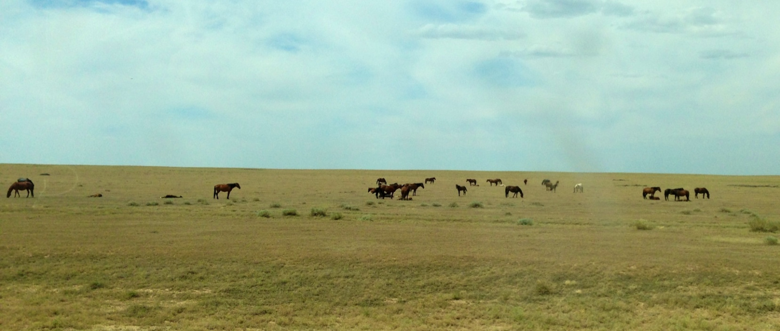 Jadąc na południe w stronę Almaty, krajobraz powoli zaczyna się zmieniać, ale tylko pod względem pojawiających się pagórków i wzniesień. Zamiast krów można zauważyć pasące się konie. Nadal jak okiem sięgnąć nieurodzaje. Drogi nie są tu nienajlepszej jakości, ratuje nas mały ruch na nich. Można więc w miarę równo jechać. Zdecydowanie poprawiła się pogoda, na termometrze już 27 stopni i pełne słońce. Dziś nocleg na bardzo urokliwym wzniesieniu nad jeziorem Balquash. Ten specyficzny zbiornik wodny ma 46% objętości wody słodkiej i 54% wody słonej.