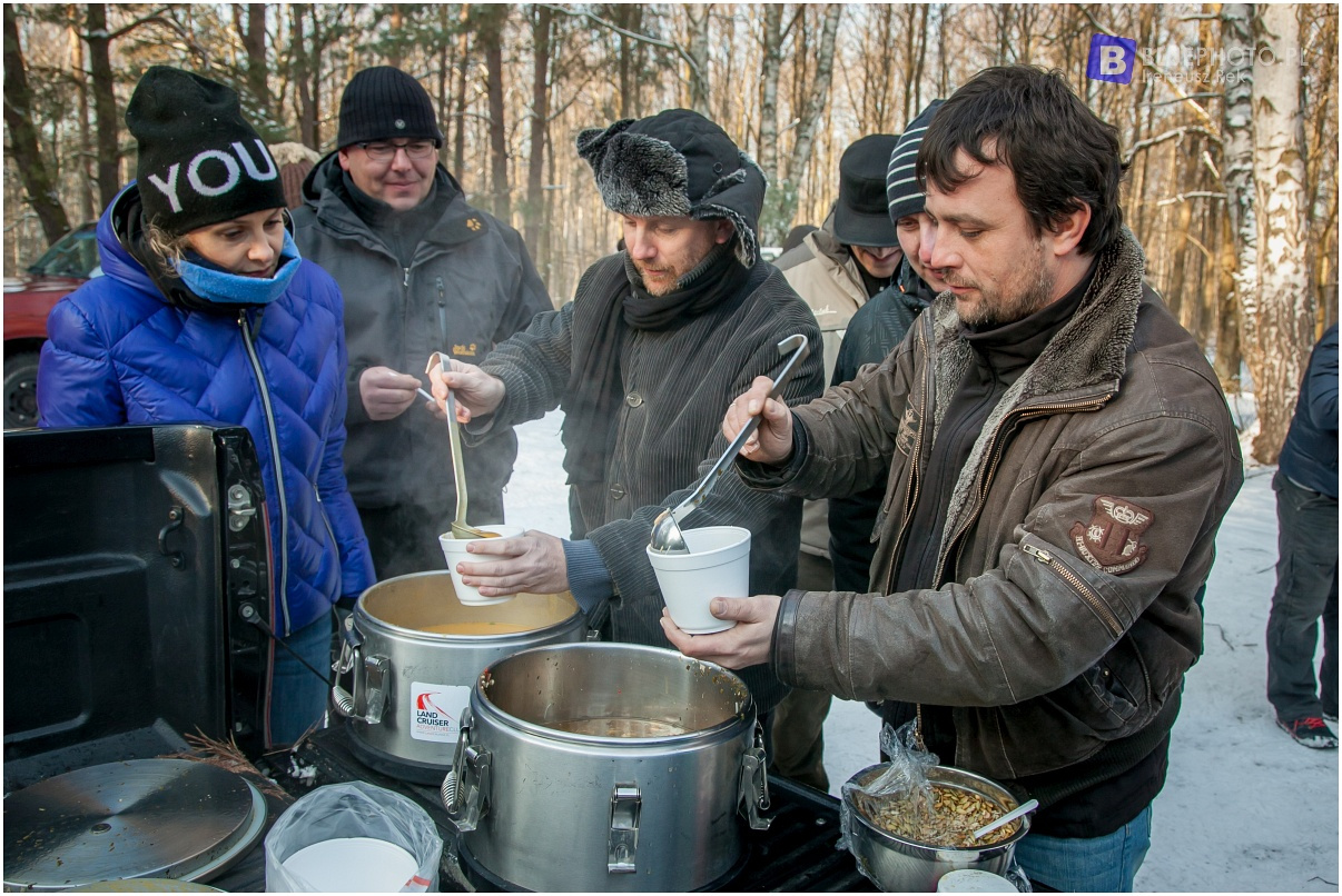 Asfaltami przebiliśmy się gdzieś w pobliże tamy w Dębem, by już dalej przemykać pomiędzy ośnieżonymi drzewami, lasami, wioskami. Za oknami Mazowsze pokazało się od tej dzikszej strony. Ośnieżona pustka, bezludne od mrozu wioski, nieliczne wąskie asfalty posypane śniegiem. Po przejechaniu mostu w Nowym Dworze i pokonaniu krótkiego odcinka asfaltu dotarliśmy do Kampinoskiego Parku Narodowego. Parking pod Palmirami to doskonałe miejsce, aby te naście aut zaparkowało i żeby zaproponować wszystkim ciepłą przekąskę w postaci 2 zup do wyboru. Piotr Poterała, który zawsze je przygotowuje, z zadowoleniem przyglądał się jak dwa spore gary szybko się opróżniły, pokazując dno. Zupy znakomite, każda spróbowana i zjedzona z powtórką ze smakiem!