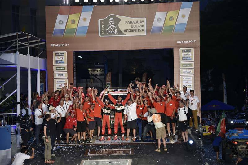 Po 13. triumf w Dakarze sięgnął w zakończonym właśnie rajdzie Stephane Peterhansel. W tym roku siódmy raz okazał się bezkonkurencyjny wśród kierowców samochodów. Wcześniej zwyciężył w tej kategorii w latach 2004, 2005, 2007, 2012, 2013 i 2016. Pozostałe wygrane notował jeszcze w latach 90. jako motocyklista. Toyocie pozostały na pociechę czwarte miejsce Naniego Romy, piąte Giniela de Villiersa. W klasie T2 najlepszy okazał się team Land Cruiser Toyota Auto Body. Land Cruiserem 200 zwyciężyli francuski kierowca Christian Lavieille i nawigator Jean-Pierre Garcin. Drugie miejsce również zajęło auto zespołu prowadzone przez Akire Miura i francuskiego nawigatora Laurenta Lichtleuchtera.
