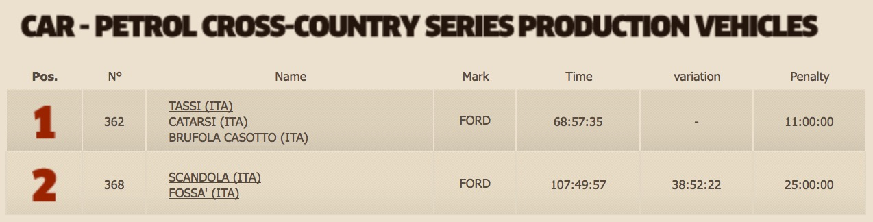 Powiedzieć, że Toyota wygrała w klasie T2 to nie powiedzieć nic. W grupie 2 (samochodów seryjnych z silnikiem Diesla) do mety dojechały wyłącznie Toyoty Land Cruiser, modele 200 z silnikiem V8 i 150. W grupie aut benzynowych rajd ukończyły dwa Fordy Raptory, jednak najszybszy Raptor znalazł się na mecie z czasem 68:57:35, o 19 godzin później od najwolniejszego Land Cruisera, który zakończył rajd z czasem 49:58:40. W stosunku do lidera klasy T2 Ford stracił 29 godzin.