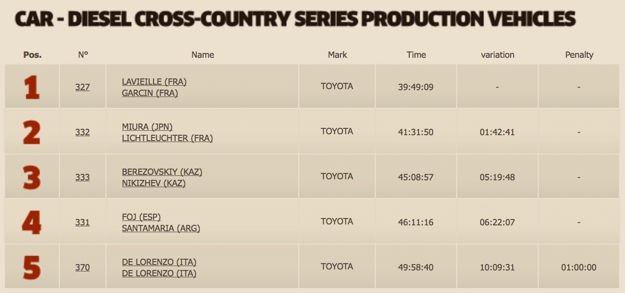 Toyota nie zrealizowała swoich ambicji w klasyfikacji generalnej Rajdu Dakar, jednak już po raz 4. z rzędu wygrała w klasie aut produkcyjnych. Pierwsze miejsce zajął zespół Toyota Auto Body w składzie Christian Lavieille i Jean-Pierre Garcin, prowadzący Land Cruisera VDJ200. Duet zajął 23. miejsce w klasyfikacji generalnej.