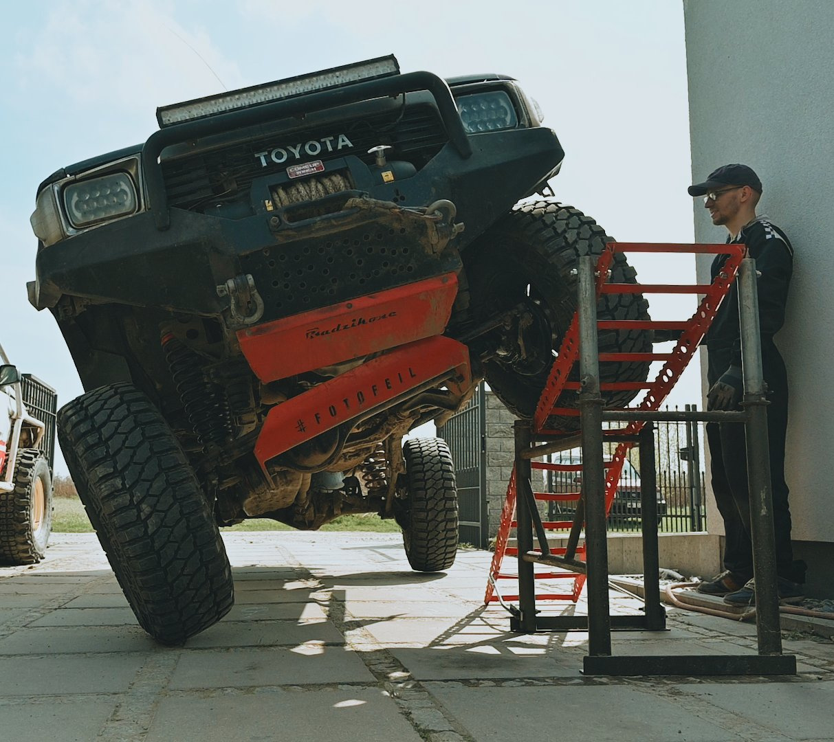 Głównym elementem chroniącym przód auta jest solidny, stalowy zderzak. Pojazd ma już swoje lata, więc taka konstrukcja nie stanowi problemu jaki napotkacie, gdy chcielibyście zamontować go w nowszych pojazdach po 2007 roku. Patrząc na tego 4Runnera od razu zauważycie czerwone osłony pod zderzakiem. Są dwie sztuki. Górna chroni chłodnicę, a niższa, przykręcona pod mostem, osłania wszystkie drążki, które w tym modelu toyoty są przed mostem i mogłyby ulec uszkodzeniu. Bez niej bardzo było łatwo o wygięcie tych drążków.