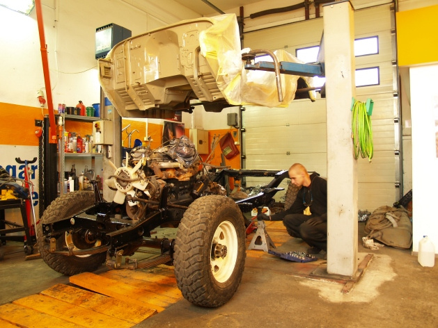 W mostach wymienione zostały wszystkie uszczelnienia, łącznie z filcowymi i gumowymi uszczelnieniami kół. Zastosowaliśmy nowe łożyska zwrotnic, a po przeglądzie pozostałych łożysk wymieniliśmy tylko jedno łożysko piasty w tylnym moście. Następnie zabraliśmy się za układ hamulcowy, gdzie wymienione zostały wszystkie cylinderki układu hamulcowego oraz wszystkie przewody miedziane. Mosty polakierowane zostały farbami antykorozyjnymi na czarno, a zaciski przednie oraz tylne bębny pomalowaliśmy lakierem odpornym na temperatury do 850 st.C..