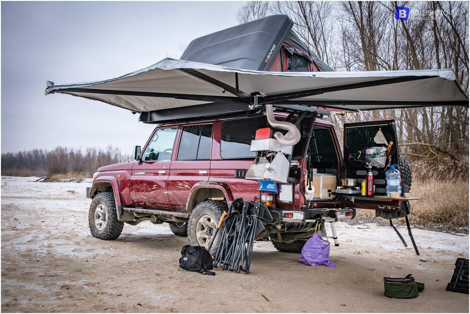 Autorem wielu prac, które przystosowują auto do dalekich podróży, jest firma podkrakowska AUTOMEBLE. Wycieczka z okolic Nowego Sącza to sporo kilometrów, jednak Kuba nie żałuje tej podróży i po roku użytkowania tych rozwiązań nie zmienił zdania. Podstawą wyposażenia kempingowego jest bagażnik, który stanowi solidną platformę dla namiotu dachowego firmy I-KAMPER. Jest to konstrukcja skorupowa, dosyć łatwa w przygotowaniu do noclegu i pakowania (więcej o namiotach). Posiadany wcześniej miękki namiot nie sprawdził się. Na mrozie twardniał i jego składanie stanowiło nieustające źródło stresu oraz niecenzuralnych wyrazów. Bagażnik jest również nośnikiem oświetlenia biwakowego firmy OSRAM oraz lamp używanych do oświetlania drogi i terenu marki LAZER.