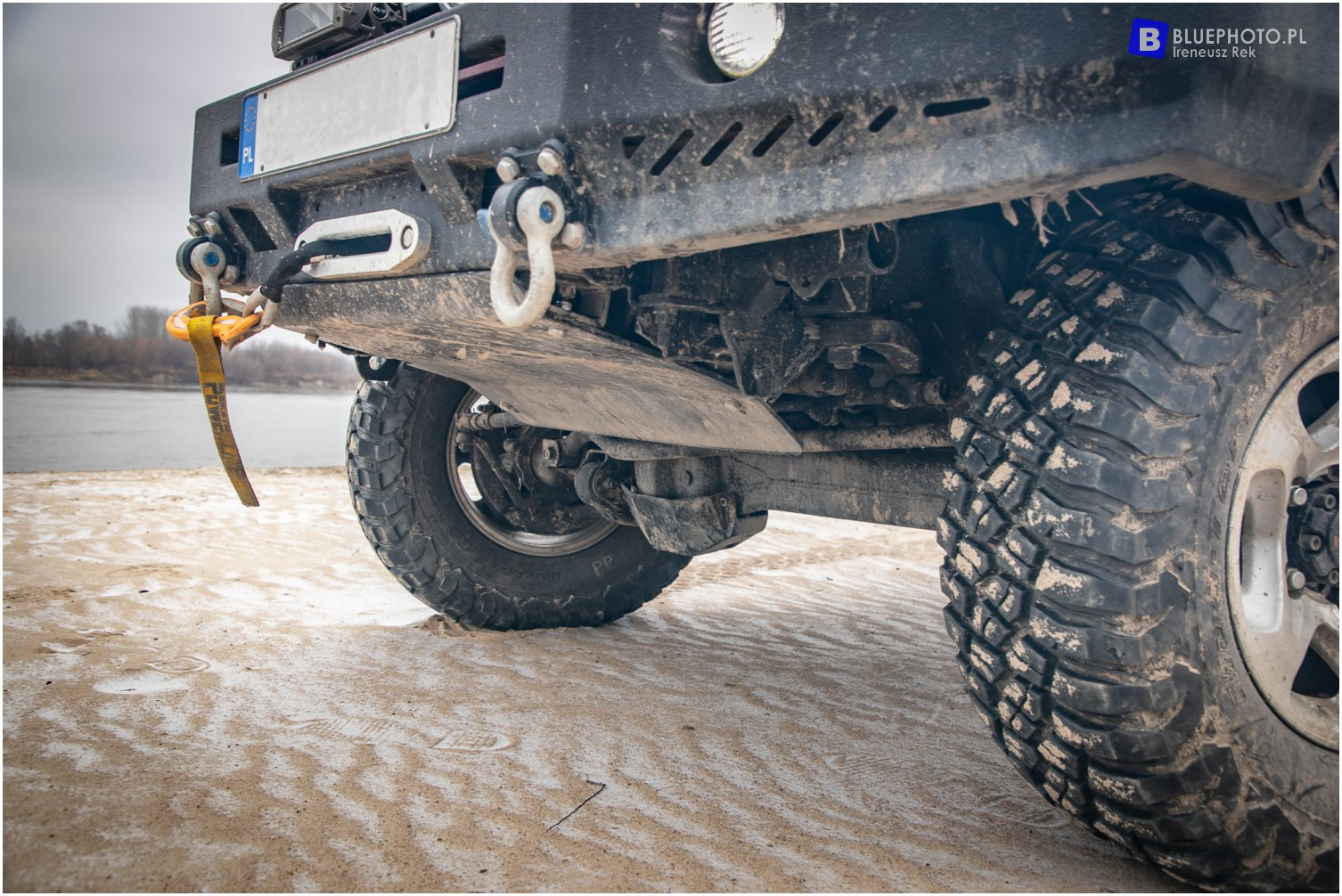 Poruszanie się w terenie to przede wszystkim opony. Na felgi trafiło więc ogumienie BG Goodrich MT w rozmiarze 285/75/16. Poza tym zdolności offroadowe poprawia możliwość spuszczenia powietrza i uzupełnienia ciśnienia w kołach dzięki kompresorowi ARB z wyjściami umieszczonymi pod fotelami z przodu.