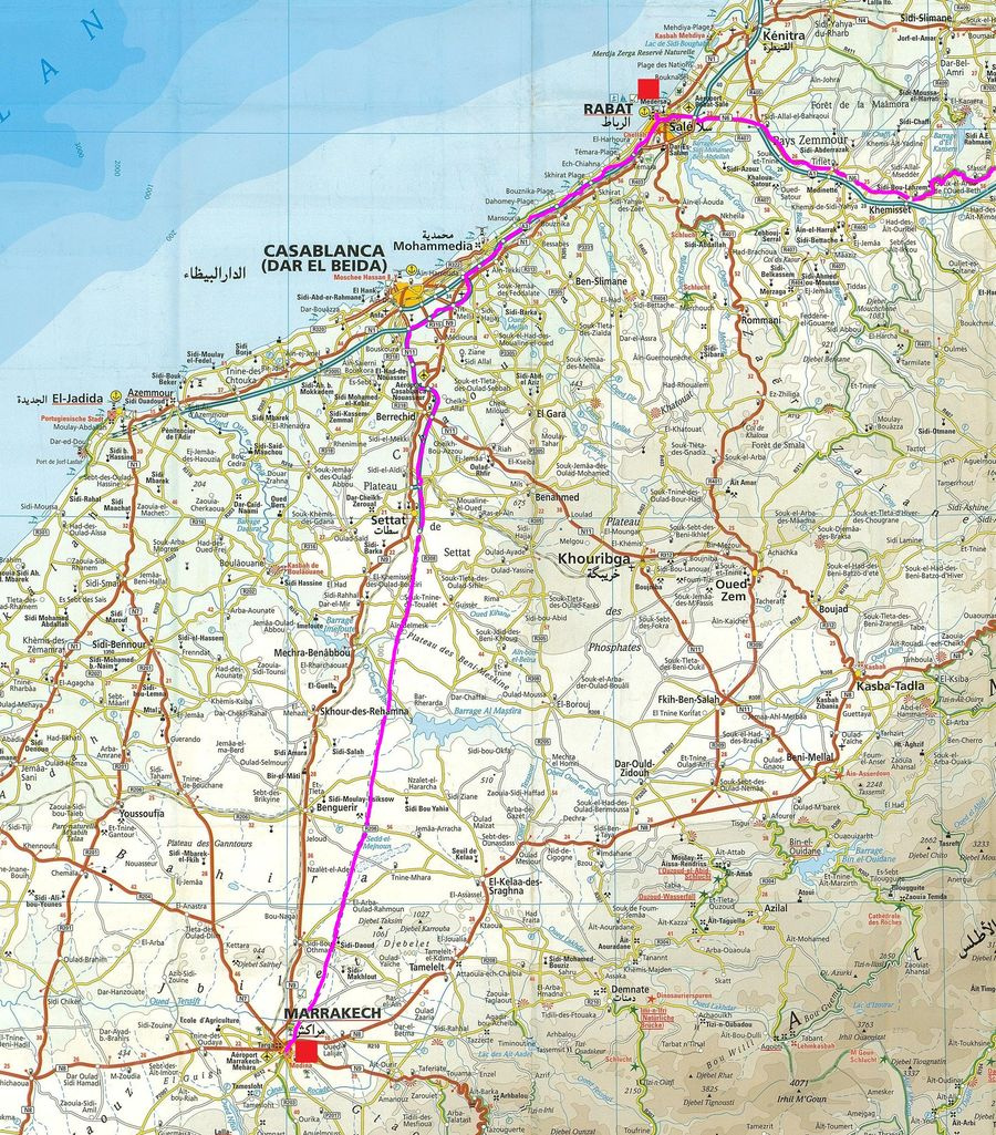 Cudowne andaluzyjskie ogrody i kawiarnia z lokalnymi ciastkami i widokiem na zatokę. Przechodzimy do tętniącej życiem medyny, z pewnością ustępującej charakterem tej z Meknes, jednak pozbawionej natłoku turystów, klimatycznie tchnie pełną autentycznością. Na koniec pojechaliśmy zobaczyć symbol miasta… Wieżę Hassana, która jest częścią nigdy nieskończonego meczetu, który swym pięknem i potęgą miał przewyższać te mieszczące się w Mekce czy Medynie. Nie doczekał się ukończenia i wraz z przylegającym do niego mauzoleum króla Mohameda V, jest atrakcją nie tylko dla turystów. I przyszła pora odebrać nasze paszporty. Jedziemy ponownie pod Ambasadę Mauretanii, bardzo sprawnie odbieramy co nasze i pędzimy prosto do Marrakechu (Marrakesz), nową, płatną autostradą (łączny wydatek 100 MAD), pozostawiając z boku potężną i rozległą Casablankę… miasto stworzone przez Francuzów na bazie rybackiej wioski w 1906r., na wzór i podobieństwo Marsylii… obecnie to ponad trzy milionowy moloch, ośrodek przemysłowy i portowy, borykający się ze skrajną biedą i nie mający nic wspólnego ze słynnym filmem i rolą Ingrid Bergman i Humphrey’a Bogarta pt. „Casablanca”.