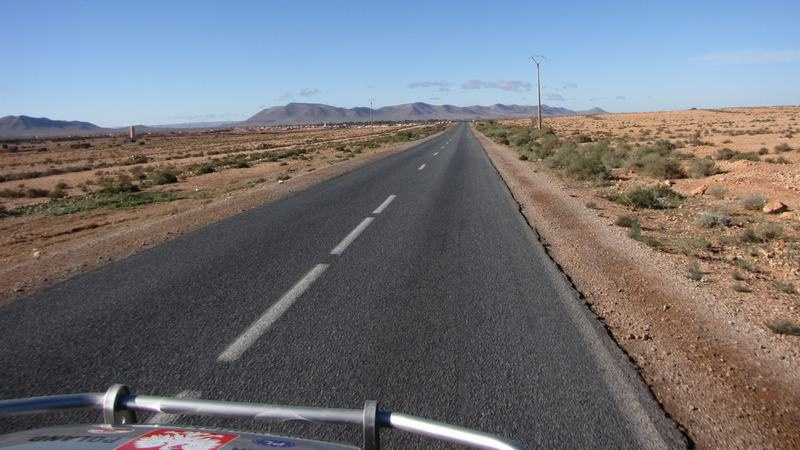 Dzień mozolnej jazdy na południe. Kierujemy się na wielkie nic, krajobrazy dość monotonne, pustynia skalno-pieszczysta porośnięta skromną roślinnością w postaci krzaczków. Zardzewiałe pagórki obsypane zardzewiałymi kamieniami, jest coraz bardziej sucho i sennie, ale zdarzyło się wreszcie coś, co przerwało jednostajność… mandat w wysokości 300 MAD… przekroczyliśmy prędkość o 3 km/h. Policjanci byli bezwzględni w roszczeniach i wręczyli nam papier formatu A4 z całym naszym wykroczeniem. Jedziemy prawie cały czas wzdłuż brzegu Atlantyku, gdzie ląd kończy się klifem. W towarzystwo wdaje nam się coraz więcej piasku i kontroli policji. Mnóstwo rybaków wysiaduje klify, w nadziei na złowienie ryb, ich obserwację przerywa nam dziura w ziemi, wypłukana przez ocean. W Tarfaya, dojeżdżamy do nabrzeża i zwiedzamy niegdysiejsze szczątki hiszpańskiego fortu, do którego podczas odpływu można dojść suchą stopą. Nic specjalnego, niewielka budowla na skale, ale za to fajny mecz w pobliżu. Tuż przed Laayoune (72km), w Tah przekraczamy granicę byłej Sahary Zachodniej. Obecnie obszar ten wcielony jest do Maroka, jednak sytuacja ta nie do końca jest uznawana przez całe gremium międzynarodowe. Ta dawna kolonia hiszpańska (jako Sahara Hiszpańska, wcześniej jako Hiszpańska Afryka Zachodnia), w północnej Afryce nad Oceanem Atlantyckim, to także państwo proklamowane w 1976 r. przez Front Polisario i częściowo uznane przez 50 państw. Obecnie okupowana przez Maroko, które nazywa ją Prowincją Południową. Sahara Zachodnia graniczy z Marokiem, Algierią i Mauretanią. Do dzisiaj nie zostały rozstrzygnięte spory o przynależności lub samodzielności tego terytorium, do dziś nie odbyło się zapowiadane referendum w tej sprawie. Prof. Adam Kosidło autor książki „Sahara Zachodnia. Fiasko dekolonizacji czy sukces podboju?” pisze, że świat zapomniał o Saharze Zachodniej – jedynej afrykańskiej kolonii, która nigdy nie uzyskała niepodległości, która znalazła się pod brutalną okupacją Maroka. Jej mieszkańcy znikają bez śladu, a wiatr pustynny i ruchome piaski niekiedy odsłaniają ciała zamordowanych i jak mawiają sami Saharyjczycy… to największe więzienie świata. Szesnaście lat wojny między partyzantami Frontu Polisario a wojskami marokańskimi i dwadzieścia pięć lat negocjacji nie przyniosły rozwiązania konfliktu. W jego wyniku połowa rdzennej ludności uciekła do Algierii i mieszka w obozach uchodźców, druga żyje pod marokańską okupacją. Dzieli ich zbudowany przez Marokańczyków „mur wstydu” … fortyfikacja wojskowa, od której większy jest jedynie Wielki Mur Chiński. Tymczasem organizacje międzynarodowe, powołane by bronić pokoju na świecie, zdają się cierpieć na ciężki przypadek hipokryzji i przewlekłej niemocy… marginalny obszar… wielostronny konflikt…