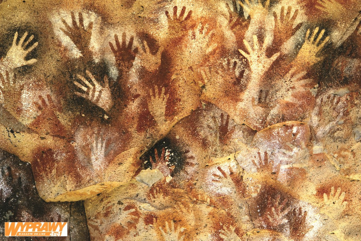 800 rąk na skale Bajo Caracoles to pogrążony w pyle przysiółek, na który oprócz hotelu i pola namiotowego składają się trzy domy i stacja benzynowa, na której akurat skończył się olej napędowy – dostawa ma być za trzy godziny. Nieliczni mieszkańcy żyją z turystów, przybywających tu, by odwiedzić sławną Cueva de los Manos. Aby dotrzeć do owej Jaskini Rąk, musimy przetrwać koszmar jazdy przez pięćdziesiąt kilometrów drogi pełnej głębokich wądołów i pralki. Na stromym podjeździe Land Cruiser nie jest w stanie osiągnąć prędkości, przy której mógłby ślizgać się po szczytach wybojów, więc podskakujemy szaleńczo w fotelach przy akompaniamencie jęków torturowanego samochodu. Wreszcie docieramy na płaskowyż, rozcięty imponującym kanionem, na dnie którego płynie Rio de las Pinturas. Wzdłuż wody wije się wąska linia roślinności, podkreślając tylko porażającą, zdominowaną żółtymi i brązowymi barwami jałową pustkę. Cueva de los Manos ze swymi najstarszymi w Argentynie malowidłami naskalnymi wpisana jest na Listę Światowego Dziedzictwa UNESCO. Wbrew temu, czego się spodziewaliśmy, malowidła nie znajdują się w jaskini, a na skalnej ścianie osłoniętej klifem. Na długości sześciuset metrów ciągną się namalowane tysiące lat temu wizerunki guanako, sceny polowań i – najbardziej intrygujące – około ośmiuset wizerunków dłoni, z których 95% przedstawia lewą dłoń. To jakby negatywy. Artysta nabierał trochę ciekłego barwnika w rurkę, przykładał dłoń do skały i tryskał na nią barwnikiem z rurki, pozostawiając na skale konturowy cień swojej dłoni.