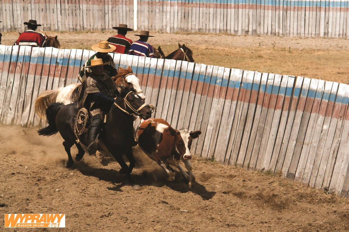 Po kilku dniach wracamy do Puerto Río Tranquilo, gdzie właśnie ma zacząć się rodeo. Na skraju wioski znajduje się medialuna – arena o kształcie półksiężyca, na której kowboje na koniach ujarzmiają byki. W Argentynie kowbojów zwie się gauchos, tu nazywani są huascos. Większość huascos pracuje w estancias, gdzie zajmują się wypasem bydła. Z okazji rodeo huascos odziani są w w tradycyjne stroje: paskowane spodnie, krótkie kamizelki i poncho, a także wymyślne skórzane buty z ciężkimi ostrogami. Działając parami, mają za zadanie trzykrotnie w określonym miejscu przyprzeć byka do ogrodzenia. Gdy pytam któregoś z miejscowych, ile mają na to czasu, spogląda na mnie ze zdumieniem. Zastanawia się przez chwilę, po czym odpowiada – „To nieważne, chodzi o to, żeby dopaść byka trzy razy. Nie, czas się nie liczy”. I takie właśnie jest życie w tej części świata. Czas nie ma znaczenia, a w każdym razie nie takie, jak u nas. Rodeo to esencja machizmu, to popis siły i jeździeckiej zręczności mężczyzn, a ta jest rzeczywiście imponująca. Mnie jednak bardziej zadziwia szybkość byków, które są czasem nawet szybsze od koni. Nie wiem, czy to kwestia strachu, czy przebiegłości, ale kilka razy bykom udaje się umknąć przed sztuczkami huascos, za co ci zbierają punkty karne.