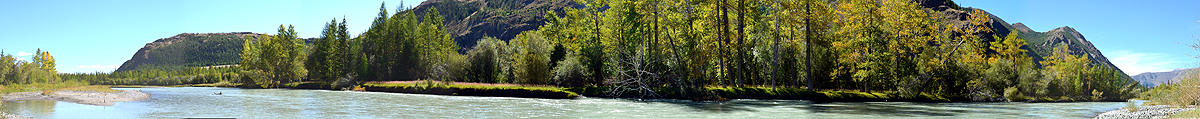 W końcu wdrapaliśmy się, po przeszło dwóch godzinach, na szczyt. Roztaczał się stąd wspaniały widok na dolinę Czuji. Można było podziwiać jak z lotu balonem, kilkudziesięciokilometrowy odcinek rzeki Czuji, ozłoconej jesienią i lśniącą stonowanym, mlecznym błękitem wody. Po przeciwnej stronie wznosiły się pozbawione drzew szczyty. Porastały je krzewy i mchy, w różnych odcieniach czerwieni. Poza nimi bielały śniegiem szczyty Ałtaju chińskiego, równe prawie wysokością Biełusze.