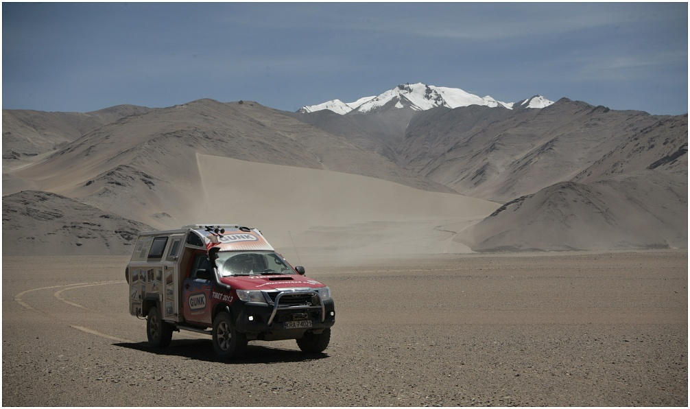 rok wcześniej z Tybetu, zagłębiliśmy się już w piaszczysko na kilka kilometrów. Ale ponieważ nie mieliśmy odpowiednich trapów a łopaty nie budziły naszego zaufania, stwierdziliśmy, że Takla Makan musi na nas jeszcze poczekać. W dodatku nasi chińscy przewodnicy, z którymi współpracujemy od lat, stwierdzili, że taka eskapada jest absolutnie niewykonalna. Analiza zdjęć z Google Maps podpowiadała nam jednak co innego. W drodze do Pekinu, gdzieś na wysokości Hotanu, w kilka samochodów (dwa przebudowane według naszej koncepcji Hiluxy oraz dwie Toyoty Land Cruiser) zbaczamy więc ze szlaku i wjeżdżamy w pustynię. Z ciśnieniem w oponach obniżonym do 1,2 bara cierpliwie posuwamy się na północ. Wiatr dokucza ale przynajmniej tumany wzniecanego piasku osłaniają nas trochę od palących promieni słońca. Wygląda to jak takie małe zachmurzenie albo wręcz zamglenie o żółtawym odcieniu. Łagodzi ono nieco uciążliwość i złośliwość Pana Celsjusza do jakichś 39 stopni wewnątrz klimatyzowanych samochodów. Na zewnątrz temperatura dochodzi do 49 i pół stopnia. W cieniu!
