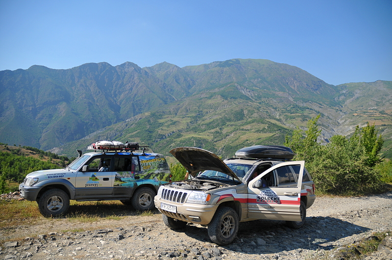 Generalnie nie robimy zdjęć, nie kręcimy filmów bo walczymy! Jeep pierwszy raz ze swoim nowym kierowcą i jego rodziną jest w takim terenie, na pokładach samochodów w sumie trójka dzieci i jedna ciężarna a za oknem oprócz pięknych widoków słychać tylko ryk silników samochodów, które walczą o każdy metr. Lekko nie było. Trasa technicznie trudna. W deszczowy dzień bardzo trudna/nieprzejezdna. Na początku tego dnia zakładaliśmy, że dojedziemy dzisiaj do połowy drogi. Podejmiemy decyzję, czy kierujemy się na południe Albanii, czy kontynuujemy trasę off. Tego dnia niestety nie udało nam się dojechać do połowy trasy. Zatrzymujemy się na jeden z najpiękniejszych noclegów tego wyjazdu. Po środku niczego, gdzieś na przełęczy, na wysokości ok 1200m n.p.m., z niesamowitymi widokami na wschód i zachód...