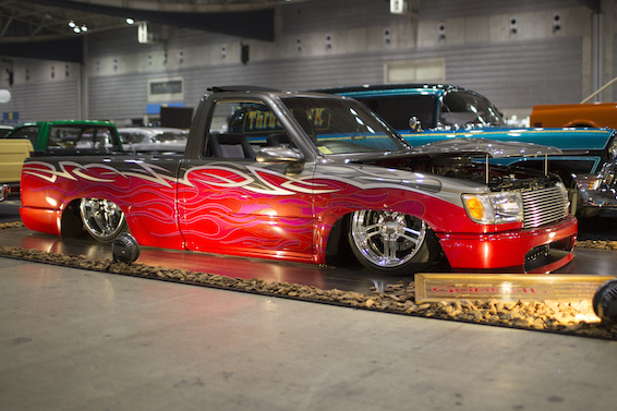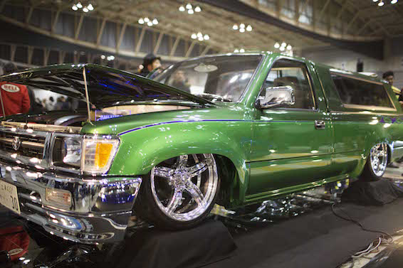 Firma Tadomiego z Omitama City odpowiada za jeden z najbardziej niesamowitych pojazdów na tegorocznych targach. To Hilux w japońskiej specyfikacji z 1992 roku w intensywnym zielonym kolorze, z metalowymi zdobieniami o niebieskim zabarwieniu. Wyposażono go w zainstalowany z tyłu, przerobiony, ostro podrasowany i chromowany dwulitrowy silnik od Toyoty MR2 drugiej generacji. Z przodu w miejscu silnika umieszczono – również chromowany – zbiornik paliwa, a po bokach silnika najbardziej wyrafinowane i pięknie wykończone zawieszenie pneumatyczne.