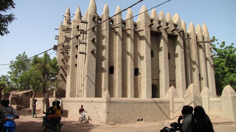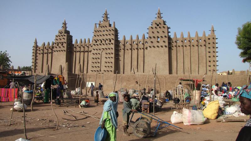 Już od 8.00 zwiedzamy Djenne. Na skalę Mali jest miastem zupełnie wyjątkowym, istnieje tu nadal czterdzieści szkół koranicznych (więcej niż gdziekolwiek indziej w Mali), jest też sporo wspaniałych budynków i rezydencji kupieckich oraz największy na świecie błotny meczet. To właśnie ten meczet, jest magnesem przyciągającym turystów. Powstał na początku XXw. jako replika średniowiecznej świątyni, która w XIXw. została zrujnowana przez ultraortodoksyjnego władcę miasta. Wielki Meczet w Djenne to największa gliniana budowla sakralna i największy wolno stojący budynek z cegły suszonej na świecie – jego powierzchnia wynosi 75 x 75 m (5.625 m²). Budowlę tę uważa się za najważniejsze osiągnięcie sudańsko-sahelskiej architektury. Meczet zalicza się do najbardziej znanych budowli w Afryce i został w 1988r. wraz z zabytkowym centrum Djenne, wpisany na listę światowego dziedzictwa UNESCO. Współcześnie meczet zamknięty jest dla nie-muzułmanów po incydencie ze zorganizowaniem na jego dachu i w pomieszczeniach modlitewnych sesji fotograficznej dla producentów odzieży. Za wstawiennictwem naszego przewodnika, po uzgodnieniach z imamem i uiszczeniu stosownej opłaty (10tys. CFA od os.), mamy zezwolenie na zwiedzenie tego niezwykłego obiektu od środka, a syn jego ma mieć nas na uwadze. Zapłata, jakoby ma wspierać prace rekonstrukcyjne.