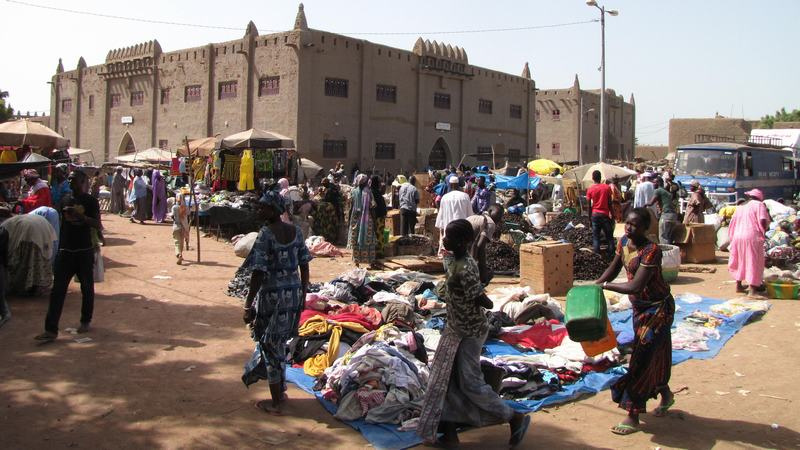 Resztę czasu przeznaczonego na zwiedzanie, spędziliśmy snując się leniwie po rozgrzanych uliczkach, podziwiając architekturę i wdychając woń ścieków z rynsztoków i śmietników, opędzając się od sprzedawców pamiątek, których na m² jest więcej, niż w jakimkolwiek innym malijskim mieście. Właśnie dzisiaj w mieście rozpoczął się okrzyczany we wszystkich przewodnikach, słynny poniedziałkowy targ i mamy okazję w nim uczestniczyć. Plac przed meczetem od rana zaczął się stopniowo zapełniać sprzedawcami ze wszystkich możliwych zakątków regionu, sprzedających cokolwiek malijska dusza zapragnie, od wędzonych ryb ryb, poprzez artefakty na odczynianie uroków, aż do motocykli. Kobiety oferują ręcznie tkane i malowane obrusy i narzuty, biżuterię z hebanu, szkła malowanego ręcznie i symbolu miasta… „pereł Djenne”.
