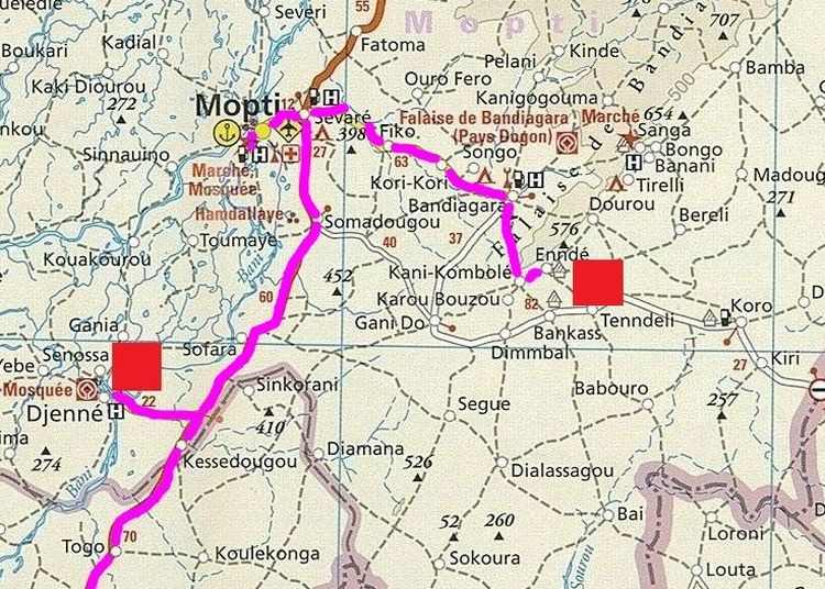Djenne > Mopti > Bandiagara > Teli (nocleg w wiosce plemienia Dogonów obok skromnej bazy turystycznej należącej do brata naszego przewodnika, który jedzie z nami od Djenne) – 230km
