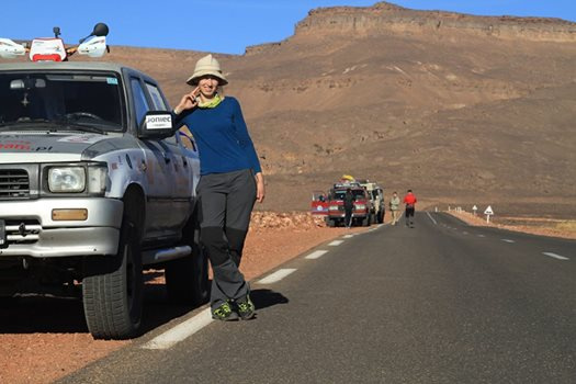 Po śniadaniu wyruszamy w dalszą trasę, Przewodnik prowadzi nas do miejsc gdzie znajdują się malowidła skalne. Potem dojeżdżamy do dużej wydmy, którą musimy pokonać, aby kontynuować dalsza trasę. Przewodnik tłumaczy jak należy jechać i pierwszy prawie pokonuje wydmę. Za nim decyduje się pojechać Kasia. Hi Lux radzi sobie super, ale musi uznać wyższość natury. My docieramy na sam szczyt, lecz stajemy niefortunnie w poprzek góry i nie obędzie się, więc bez trapów, aby zjechać z powrotem. Ponieważ Bartek nie decyduje się na próbę wjechania zawracamy, więc i musimy dotrzeć w to miejsce od drugiej strony wydmy okrężna trasą. Tak, więc zawracamy tą samą drogą i wyjeżdżamy z piasków do następnego miejsca postojowego położonego wśród gór, ale już bez pisaku. Prędkość dochodzi do 90 km/godz. Samochody mkną przez pustynię. Krajobraz to góry pokryte prawie czarnym rozpadającym się łupkiem. Rozbijamy obóz oraz nasz namiot do markizy dla Tuaregów, którzy rano są bardzo wdzięczni za to. Do tej pory spali pod gołym niebem. To jest ich normalny nocleg.