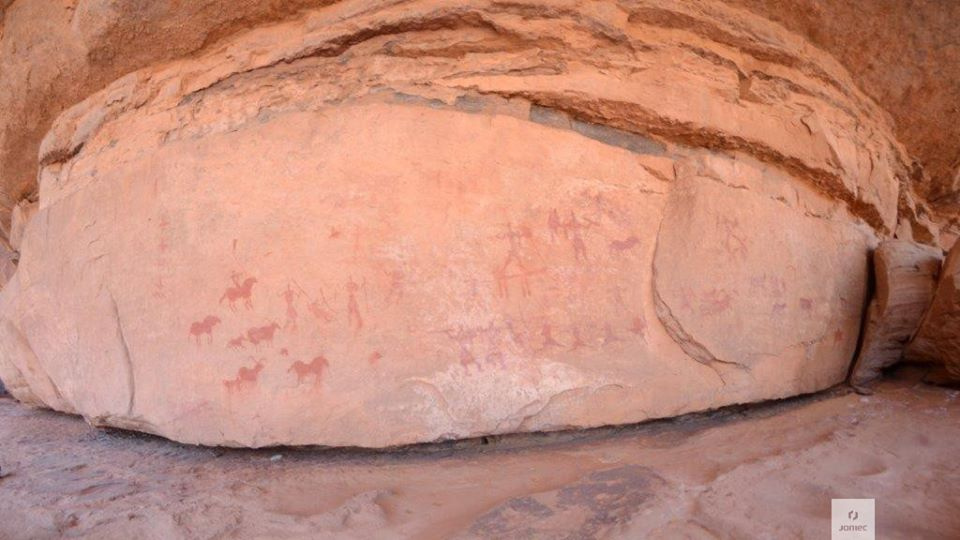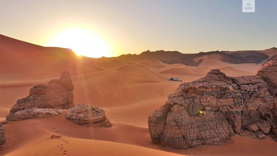 Rano szybko się spakowaliśmy i po śniadaniu odpaliliśmy dronu, aby po filmować tą okolicę. Przewodnik prowadził nas dalej w miejsca gdzie trzeba było podjechać, aby zobaczyć piękne widoki. Zatrzymaliśmy się również, aby porobić zdjęcia i po filmować trochę kamerami i dronem. Teren ten, chociaż wygląda podobnie - skaliste góry przysypane piaskiem, to jednak za każdym razem jest inny. Zatrzymaliśmy się przy niedużej ostrej skale, na której były malowidła zwierząt, a z drugiej strony postacie ludzkie. Tuaredzy śmiali się, iż jest to pornografia, trochę można się dopatrzeć aktów miłosnych. Potem jedziemy dalej przez równiny z małymi wzniesieniami a czasem kamieniami a po obydwu stronach wydmy a za nimi skały. Na noc zatrzymaliśmy się nad piękna doliną. Przed nami fantastyczny widok, chyba najpiękniejszy z całej wyprawy. Kaśka z Tomkiem swój obóz rozbili w dolinie przy mniejszej skale.