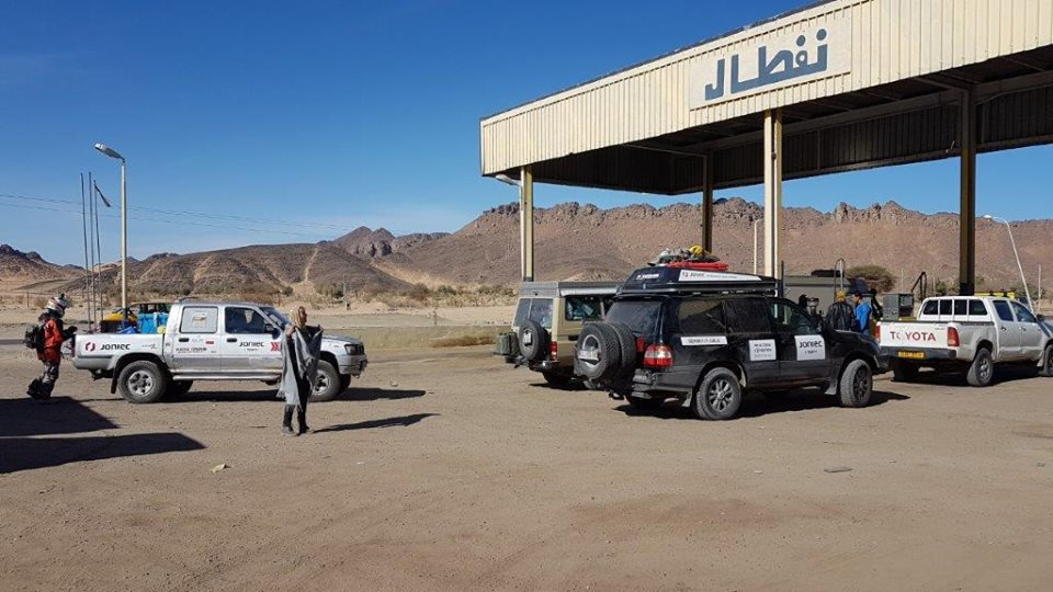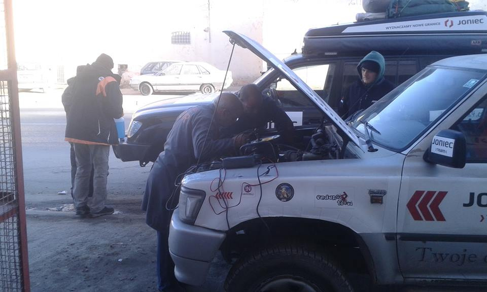 Po wczesnym śniadaniu przepakowujemy naszą Toyotę i ruszamy z Tomkiem i Kasią w poszukiwaniu mechanika. Okazało się i ż faktycznie alternator, a dokładnie szczotki do wymiany. Toyota to najbardziej popularny samochód w Afryce. Mechanicy doprowadzili samochód do jazdy i mkniemy w kierunku granicy. Tam już czeka ekipa Bartka. Granica – gorzej niż za komuny. Najpierw tunezyjska potem algierska. Masę formalności, dokumentów, czekania. Część załatwiają nasi przewodnicy, którzy będą nas prowadzić po całej trasie. Oczywiście obowiązkowe ubezpieczenie samochodu i Tomka motoru na teren Algierii. Nasze nie są tu respektowane. Okazało się, iż celnicy pomylili rejestracje i muszą to prostować. Problem, ponieważ pisanie łaciną im nie idzie. Sprawdzenie bagaży i czy nie mamy GPS-u – nie wolno nim się tutaj posługiwać. Uffff… wreszcie się udało wjechać na teren naszego docelowego państwa. Pierwszy kierunek po tanie paliwo na stację. Niestety, ale tylko 500 metrów. Było już za późno, aby można było kontynuować dalszą jazdę. Wojskowa obstawa odprowadziła nas na teren pobliskiego hotelu. My po obejrzeniu warunków zrezygnowaliśmy ze spania w hotelu i rozbiliśmy się na ternie obiektu. Wyjść gdziekolwiek dalej nie można, tak zresztą przez całą trasę. Wspólna kolacja i do spania.