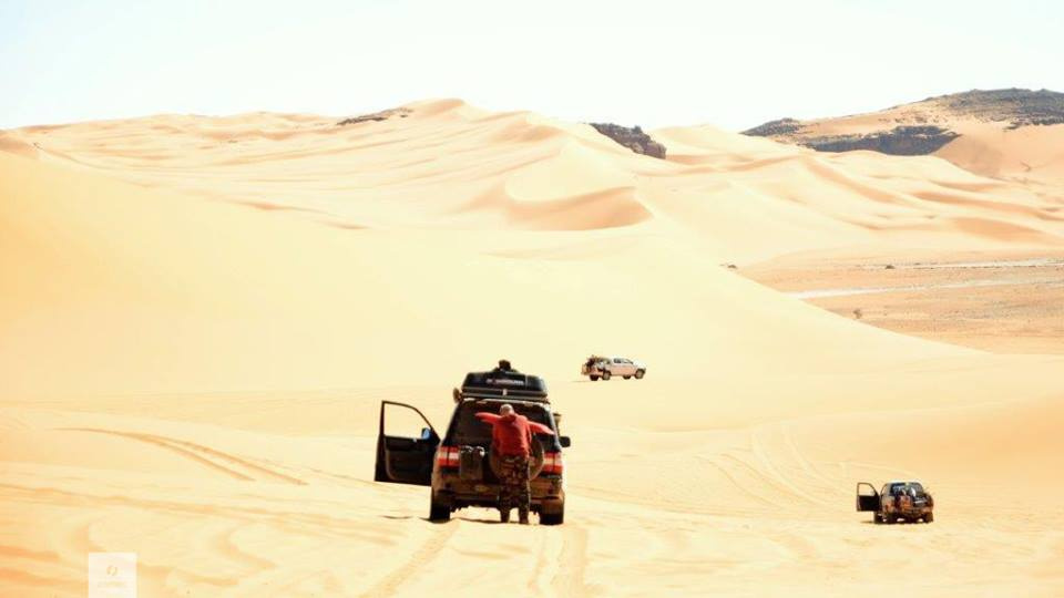 Jak zwykle przewodnik włóczy nas po pustyni. Po drodze mijamy skały i wydmy, również malowidła skalne sprzed tysięcy lat. Przewodnik zaprowadził nas do miejsca gdzie na końcu ścieżki wśród skał było małe jeziorko z woda, która podobno nadaje się do picia. My nie ryzykowaliśmy, ponieważ mamy zapas wody z Polski, a do mycia wodę z portu w Salerno. Mamy zapas 40 litrów wody w zbiorniku w samochodzie i w 2 kanistrach na zewnątrz. Fantastyczna jest woda ze Szczawy. Słona, ale na takie wyprawy idealna, ponieważ zawiera mikroelementy. Po południu rozbijamy obóz na wzgórzu. Przed nami również jak poprzedniego dnia piękny widok, który utrwalamy na fotografiach i latającym dronie. Z Tomkiem wypuściliśmy się na wydmy doliny. Fantastyczna sprawa tak sobie poszusować po piachu. Szkoda tylko samochodu, bo już czujemy sprzęgło, a przed nami kawał drogi po pustyni, nie mówiąc o drodze powrotnej.