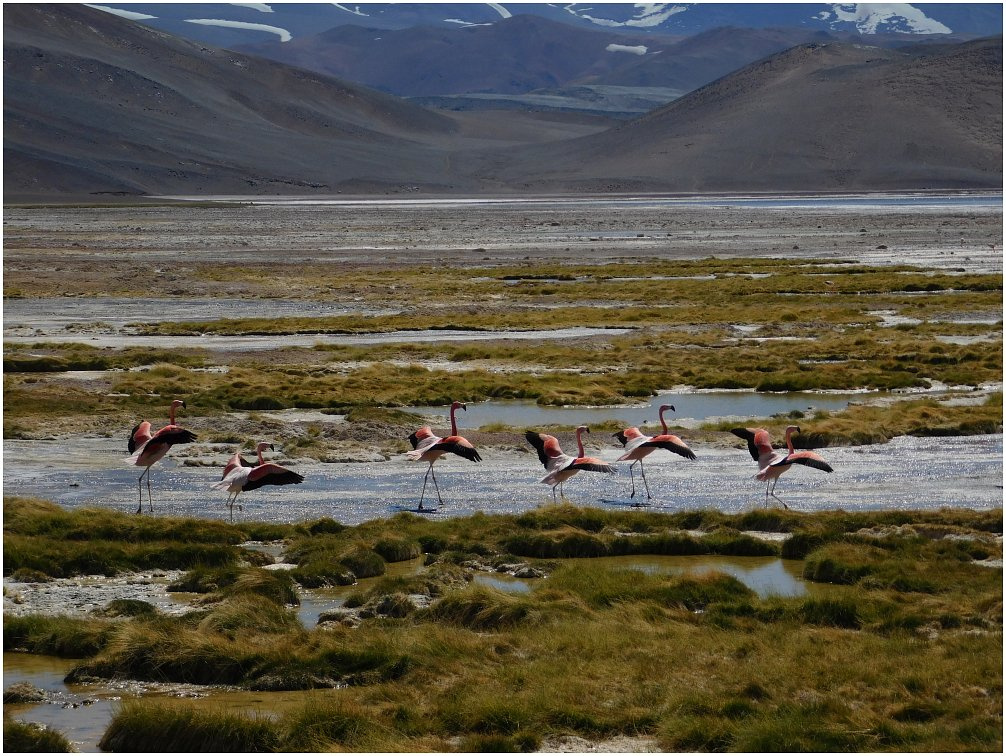 Pozaziemskie widoki, towarzystwo niemal siedmiotysięcznych wulkanów, niewielkie lodowce, penitenty, wysokości przekraczające 5.400 metrów n.p.m. I ponad 40-to kilometrowa trasa do pokonania doliną rzeki. Rano zamarznięta, w środku dnia rwąca. Piaszczyste łachy, skaliste fragmenty, przewężenia. Nierzadko huraganowy wiatr. Toyota bez problemu daje radę. Kaldera to coś większego niż krater, w tej - na wysokości około 5.200 metrów n.p.m. - znajduje się sporej wielkości jezioro. W scenerii rodem z filmów fantastycznych. Surowy, niezwykłej urody krajobraz, rzadko odwiedzany przez ludzi. Skrajnie surową, nieprzyjazną przyrodę, można zamienić na sympatyczniejszą, po drugiej stronie wulkanu Pissis. W miejscu zwanym Balcon del Pissis zobaczymy kilka różnokolorowych jezior - niemal czarnych, niebieskich, zielonych, w towarzystwie niewielkich solnisk. Mało? Widoki na najwyższe wulkany świata i największe, chociaż niewielkie, lodowce tej części Andów. Nadal nie przekonałem do zapuszczenia się w to miejsce? Dodam zatem, że można tu spotkać całe stada wikunii z rodziny wielbłądowatych oraz gromady różowych flamingów.