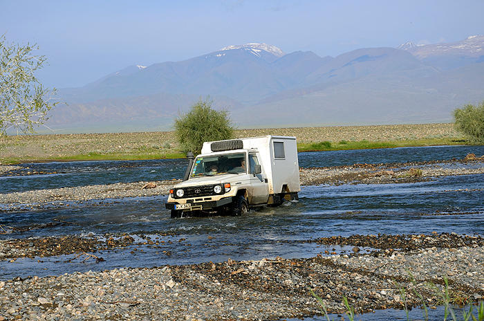 Zmarnowaliśmy kilka godzin, aby przekroczyć szeroko rozlaną rzekę. Zwiedziliśmy przy okazji wymarłe, na czas letniej pory owadów, wioski oraz zażyliśmy off-roadu błotnego. W końcu poszliśmy po rozum do głowy i pojechaliśmy bliżej gór, gdzie miast błota są kamienie, a i rzeka jest węższa. Mimo to musieliśmy zanurkować prawie metr w rwący strumień.