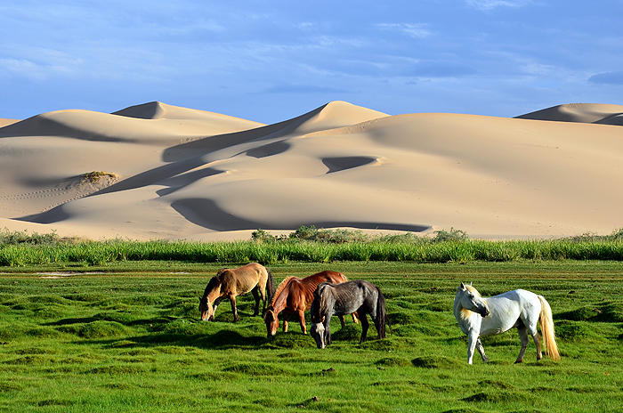 Następny dzień obfitował w wydarzenia. Już o świcie wjechaliśmy na mongolską, szutrową tarkę i skierowaliśmy Toyoty wprost na wydmy. Jest tu taki, wąski przesmyk pomiędzy górami piachu, zaznaczony na mapach wojskowych już w latach ’70-tych. Więc albo wydmy Khongoryn Els się nie przemieszczają, albo... sam nie wiem co. Jednak mimo głównej drogi wiodącej przez przesmyk do wioski Sewrej i tak musieliśmy walczyć z piachem. Silnik dawał z siebie co mógł, a koła robiły pod siebie. Można było oczywiście spuścić trochę powietrza z opon, ale udało się i bez tego. Przydałby się jednak na takie okazje jeszcze większy silnik... tak ze sześć litrów.