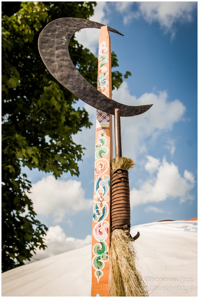 Na miejscu zatrzymujemy się przed drewnianym domkiem jakich wiele tutaj. (Uwaga - wcześniej mijamy restauracje stylizowaną na gospodę ale to nie to miejsce). Jest duży parking, chata z zacienionym i ładnie obrośniętym zielenią tarasem oraz co już bardziej egzotyczne prawdziwa tatarska jurta z wyposażeniem (można wejścia i wszystkiego podotykać, właściciele liczą na uczciwość swoich gości i do tej pory się nie zawiedli ;) oraz zagroda dla koni. Posiłki latem spożywa się na tarasie. Jest sporo ludzi ale i dla nas znalazła się duża ława przy której zmieściło się w sumie dziewięć osób (w tym troje maluchów) Ponieważ chcemy spróbować wszystkiego - zamawiamy wszystko ;). Tzn. wszystkiego po jednej porcji, żeby spróbować. No może oprócz kołdunów w rosole - te każdy ma swoje ;). Potem bielusz i pierekaczewnik. Ten pierwszy jest na cieście drożdżowym natomiast drugi - makaronowym, oba z farszem gęsim lub baranim z dodatkiem cebuli i przypraw spiralnie zawijane. Dalej pieremiacze, dzajma, czak czak i chałwa mączna, Do posiłków dostajemy syte - czystą wodę syconą miodem, doprawioną do smaku sokiem z cytryny. Desery popija się kawą "turecką" gęstą i słodką oraz herbatą, Dziś po kilku latach od wizyty w Kruszynianach (2007r) nie potrafię już dokładnie opisać co jak smakowało. Pozostało tylko ogólnym wrażeniem - wszystko było pyszne.