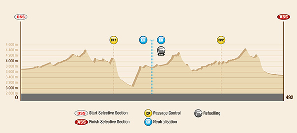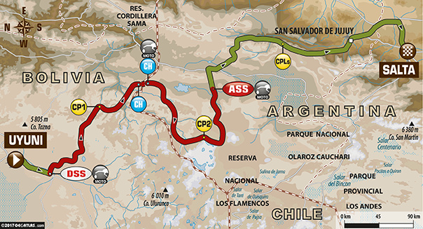 Dzisiejsza trasa z Uyuni w Boliwii do Salty w Argentynie miała mieć w całości blisko 900 kilometrów, w tym blisko 500 km odcinka specjalnego. Trudne warunki spowodowały, że już w poniedziałek została częściowo zmieniona, aby ominąć przejazd przez rzekę, która mocno wezbrała. We wtorek skrócona została o ponad 70 km pierwsza część odcinka specjalnego.